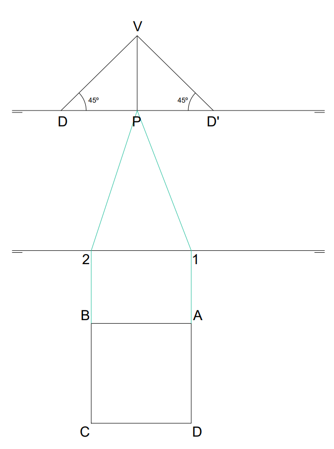 - Puntos de distancia (D y D ’): situados sobre la línea de horizonte, se colocan a los lados del punto principal. De acuerdo con el tipo de perspectiva se situarán a una distancia u otra con respecto al objeto que se va a dibujar. Hacia estos puntos se fugan las rectas de representación de las rectas horizontales que forman los ángulos preestablecidos con la figura y con el plano del cuadro.