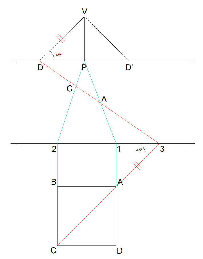 - Para encontrar la profundidad de nuestra figura y situar los puntos en las rectas fugadas, lanzaremos desde el punto A, una línea a 45 grados hasta tocar con la LT en el punto 3. Ésta será paralela a la línea a 45 grados que une los puntos D y V.