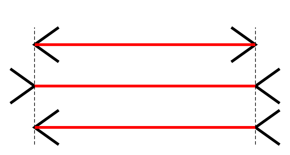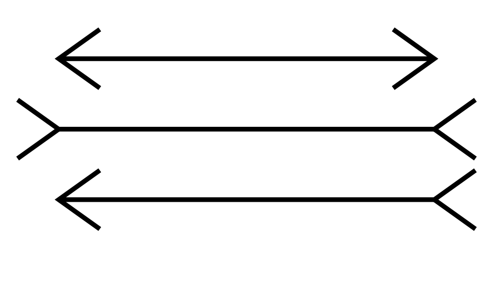 Acabas de visualizar lo que comúnmente conocemos como ilusión geométrica, al añadir los segmentos en forma de flecha, dependiendo de la dirección, provocan un efecto óptico que hacen que parezcan visualmente más extensos, a pesar de ello, si vuelves a observar los segmentos de la primera imagen, seguro que sigues pensando que alguno de ellos continua siendo más largo, pero, fíjate en la siguiente imagen y podrás ver como la longitud de los segmentos es exactamente la misma.