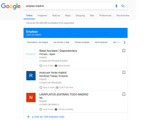 Google promete facilitar a las personas el encontrar un trabajo. Con solo indicar en la barra del buscador la palabra “empleo”, “trabajo” o alguna similar, aparecerán vacantes que se publican en internet. Así tienes la posibilidad de afinar la búsqueda por localización (a través de Google Maps) o criterios como salario o puesto.