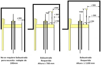 Requerimientos de la barandilla o balaustrada en función de las distancias al hueco existentes.