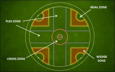 – Terreno de juego y sistema de puntuación: campo de hierba, circular, de 50 yardas de diámetro (algo más de 45 metros) dividido en cuatro zonas. Dichas zonas determinan con qué parte del cuerpo se puede tocar el balón y la puntuación a obtener: