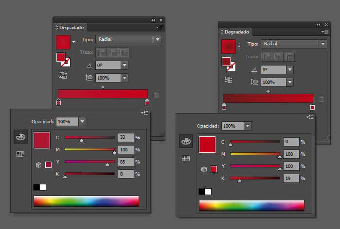 Con la herramienta rectángulo vamos a crear nuestro fondo principal de color, en nuestro caso utilizaremos un degradado con tonos rojos. Para realizar el degradado debemos dirigirnos al menú principal Ventana/Degradado y nos aparecerá el panel correspondiente para trabajar. Ahora vamos a elegir un degradado de tipo radial y hacemos clic en cada botecito de pintura para seleccionar el color deseado. En la siguiente imagen podéis ver la especificación de cada color: