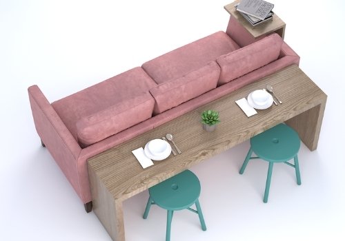 Adapta al mobiliario existente: integra elementos de soporte en tus muebles existentes de forma que te permitan darle un segundo uso. Por ejemplo: puedes integrar en los brazos de un sofá mesas auxiliares para colocar bebidas o aprovechar la parte posterior para crear una barra que te sirva como desayunador.