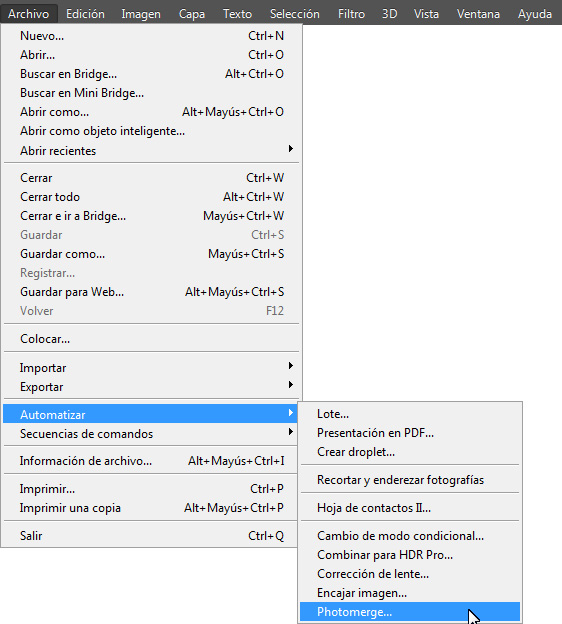 La herramienta no está a simple vista por lo que debemos dirigirnos al menú principal Archivo/Atomatizar/Photomerge:
