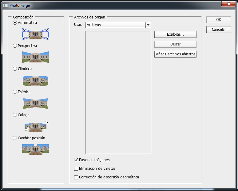 En este menú anterior podemos  hacer clic en Explorar para añadir las fotos que van a componer la panorámica. Por otro lado también podemos hacer clic en Añadir archivos abiertos si ya los teníamos abiertos en Photoshop con anterioridad.