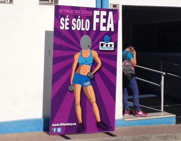 Este primer ejemplo sobrepasa los límites de la comunicación y se solucionaría simplemente dejando visible la cara de la persona y como no cambiando el eslogan, ya que es claramente sexista. Con estos cambios el anuncio funcionará igualmente sin necesidad de ofender a nadie.