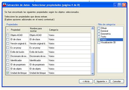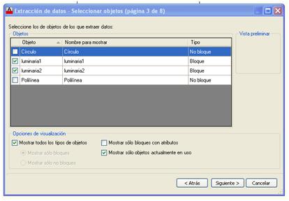 Una vez que se accede al asistente de extracción de datos, por cualquiera de las opciones indicadas al principio, aparecen varias pantallas. Para una práctica sencilla del asistente indica siguiente e introduce el nombre y ubicación del archivo hasta que llegues a la pantalla 3 de 8. En esta pantalla indica los elementos o bloques que quieres inventariar.