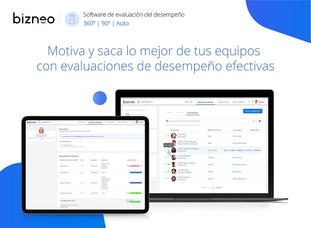 Para medir y potenciar el rendimiento de tus trabajadores recomendamos el software de evaluación del desempeño de Bizneo HR. Una herramienta para desarrollar el talento de tu plantilla de forma sencilla y 100% online. Las evaluaciones se adaptan a cualquier situación (teletrabajo, presencial) y potencian el rendimiento con las soluciones de RR.HH. más útiles (matriz de talento, KPIs, objetivos SMART, brechas competenciales…).