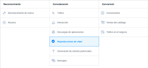 En el bloque de consideración encontramos un abanico de posibilidades más amplio donde se pueden elegir entre seis opciones: tráfico, interacción, instalaciones de la app, reproducciones de vídeo, generación de clientes potenciales y mensajes.