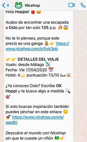 Nicehop es una plataforma que busca ofertas de viajes personalizadas en función de las preferencias de los usuarios directamente a tu teléfono móvil. Es decir, a través de la inteligencia artificial analizan tus elecciones y seleccionan la mejor oferta para las necesidades del consumidor.