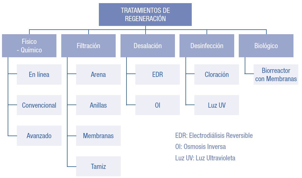 Las tecnologías de regeneración son muchas tal y como se puede ver en la Guía para la Aplicación del R.D. 1620/2007 por el que se establece el Régimen Jurídico de la Reutilización de las Aguas Depuradas así como en el siguiente esquema.