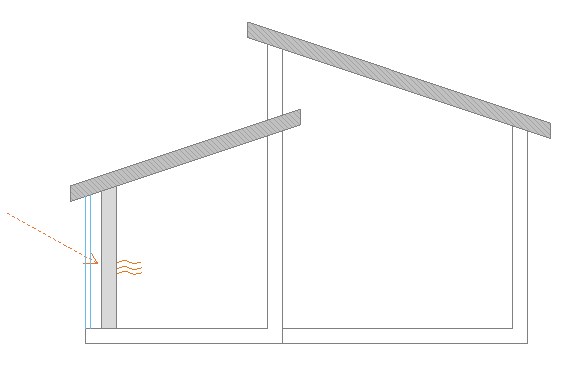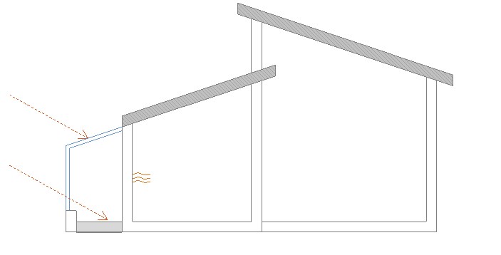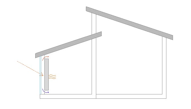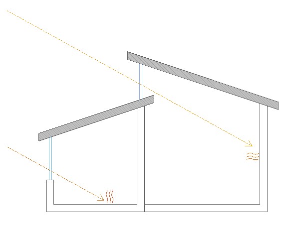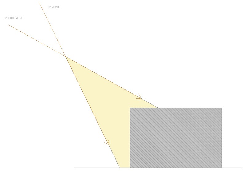 El siguiente esquema muestra como incide el sol, la vivienda próxima determina la altura más baja de entrada. Esto permite determinar que no es necesario acristalar toda la pared. En ocasiones no contemplar eso puede llegar incluso a ser contraproducente.