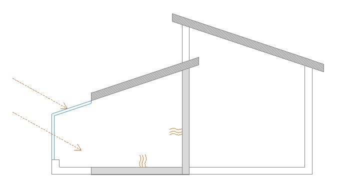Estas ganancias normalmente se alcanzan en la arquitectura solar pasiva con la implementación de invernaderos adosados. También se puede implementar en la cubierta. El sistema combina la captación directa y el muro acumulador.