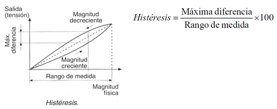 Histéresis: en algunos tipos de transductores la gráfica que relaciona la magnitud con la señal eléctrica varía y no tienen el mismo en el aumento y en la disminución. Por ejemplo, el transductor no da la misma señal para una presión de 200 pascales en función de si esa presión se ha cogido de forma ascendente o de forma descendente.