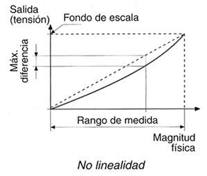 No-linealidad: es la distancia mayor entre la curva de funcionamiento del sensor (en dirección ascendente) y la recta del punto inicial al final de funcionamiento.