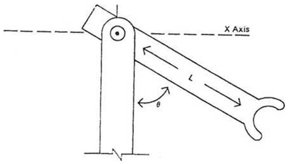 Para explorar movilidad en detalle, consideremos un robot con una sola articulación. Esta articulación particular actuará como una bisagra, cambiando las coordenadas X e Y (o cualquier par de coordenadas del punto final del elemento) a la vez. Sin embargo, estos cambios no son independientes; esto es, para cualquier posición X resultante obtenida por rotación del brazo, hay una sola posición Y posible. Para una longitud fija del elemento (L), las posiciones X1 e Y1 del punto final dependen del ángulo de elevación (θ) seleccionado, por ello el robot de la figura tiene un único GDL. El punto final del brazo puede considerarse como un movimiento en un arco.