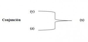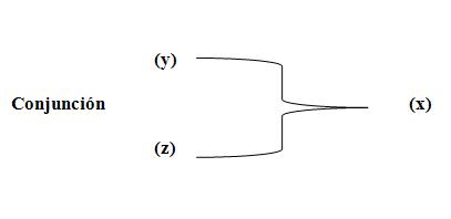 El hecho (x) tiene dos antecedentes (y) y (z). Se dice que (y) y (z) forman una conjunción que produce (x) y esta relación se representa gráficamente del siguiente modo: