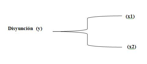 Esta situación en la que un único hecho (y) da lugar a distintos hechos consecuentes (x1) y (x2) se dice que constituye una disyunción y esta relación se representa gráficamente del siguiente modo: