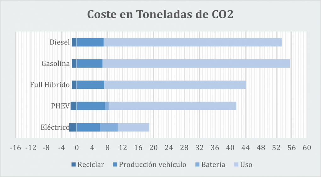 Establezcamos que un coche eléctrico tiene un mayor coste, en cuanto a huella de carbono se refiere, en su fabricación. Para el vehículo utilitario medio el proceso de fabricación (carrocería, electrónica, batería en caso de eléctrico…) es mayor para los coches eléctricos. Es a lo largo de su uso y vida útil cuando la balanza se inclina a favor de los eléctricos.