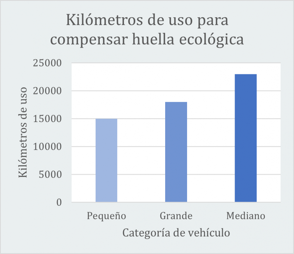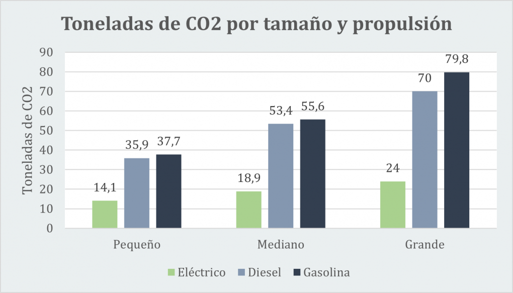 Cuando acabamos comparando las toneladas de CO2 de huella de carbono, sumando la fabricación y el uso a lo largo de toda la vida útil no nos queda lugar a dudas. Continuando con la categorización, se da como aproximación, que la vida media de un vehículo pequeño es de 170.000km, 225.000km para un mediano, como ya dijimos, y 280.000km para un vehículo grande.