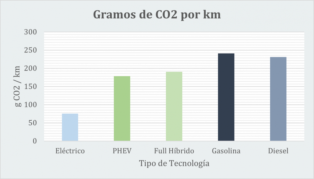 Como cabe de esperar, la tecnología que menos CO2 ha vertido es la eléctrica con 75g CO2/km. Mientras que las tecnologías híbridas oscilan entorno a 183g CO2/km, quedándose por debajo de la combustión interna de gasolina o diésel que asciende hasta 241g y 231g CO2/km, respectivamente. Una conclusión inmediata es el hecho de que un coche de gasolina o diésel implica 3 veces más g CO2/km que uno eléctrico.