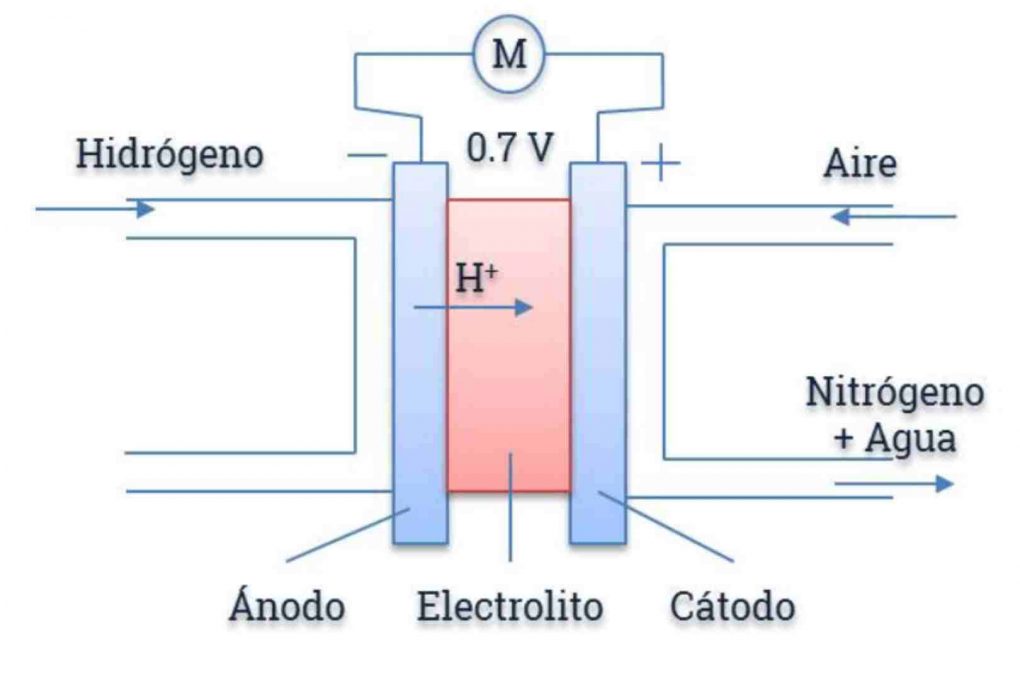 El hidrógeno (H2) atraviesa el electrodo negativo (ánodo) y se disocia en presencia de un catalizador, generando iones positivos (H+) y electrones (e–). A su vez, el oxígeno (O2) del aire penetra a través del electrodo opuesto (cátodo) y también se disocia en iones O2– mediante el catalizador. Los iones positivos de hidrógeno se desplazan a través del electrolito en dirección al cátodo, mientras que los electrones quedan libres en el ánodo. Si existe un camino eléctrico conectando el ánodo y el cátodo, los electrones lo recorrerán, generando así corriente eléctrica. En el cátodo, los iones de hidrógeno, el oxígeno y los electrones se vuelven a combinar para formar moléculas de agua.