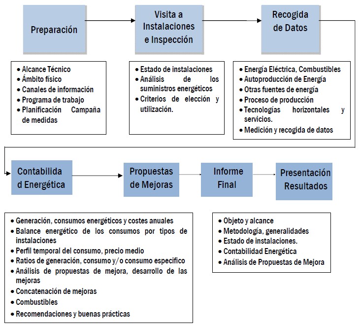 Tal y como se puede ver en el siguiente esquema en donde se muestra la metodología propuesta por la norma UNE-EN 16247, no existen muchas diferencias con su antecesora UNE 216501 en cuanto a metodología ya que esta norma, ya anulada por la actual UNE-EN 16247, tenía un carácter muy general ya que no distinguía si la auditoría energética iba destinada a un edificio, a un proceso o a un sistema de transporte.