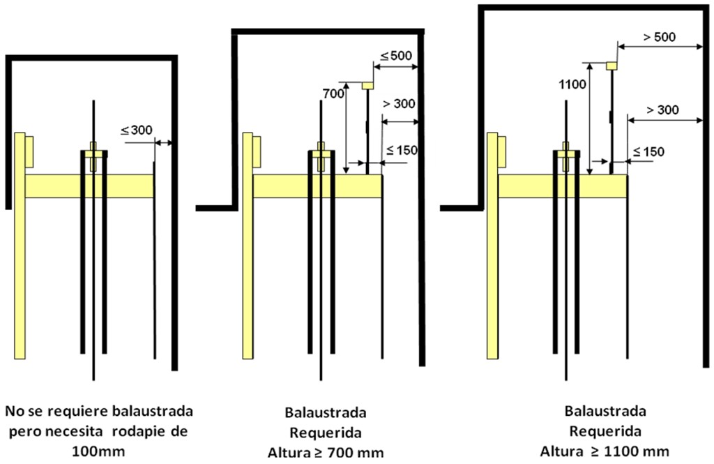 Nuevos requerimientos para la barandilla o balaustrada instalada en el techo de la cabina. Todas las cabinas deberán llevar rodapié y la balaustrada a instalar deberá soportar al menos 300N. En las siguientes imágenes se pueden ver los requerimientos en los distintos casos: