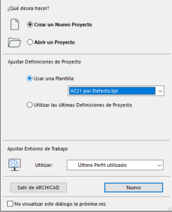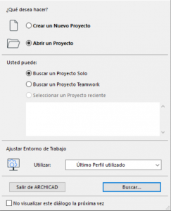 La interfaz de Archicad es fácil de utilizar. Al iniciar el programa nos permite crear un proyecto nuevo o abrir uno existente.