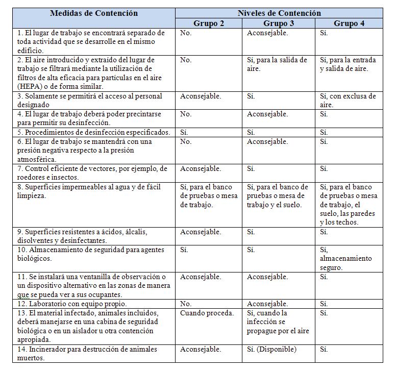 Las indicaciones relativas a las medidas de contención y a los niveles de contención, según la Guía Técnica para la Evaluación y Prevención de los Riesgos Relacionados con la Exposición de Agentes Biológicos del INSHT, son las siguientes: