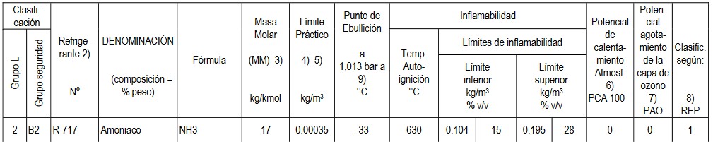 Lo primero que hay que sacar en claro del reglamento es la clasificación del amoniaco como refrigerante, en este sentido está clasificado en el grupo L2 y grupo de seguridad B2. Su fórmula química es NH3 y su identificación como refrigerante R-717.