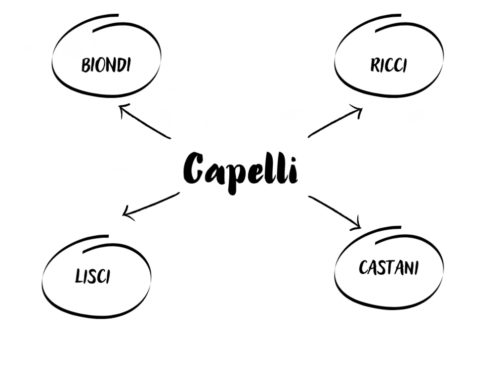 Te ilustramos con algunos ejemplos la metodología lexical aproach y cómo aprender vocabulario en italiano a través de chunks. Por ejemplo, si pensamos en el término “nariz”, adjetivos como “puntiaguda”, “aguileña”, “afilada” o “respingona” suelen asociarse a ella. Una manera visual de organizar el vocabulario sería a través de diagramas, veamos el ejemplo con la palabra capelli: