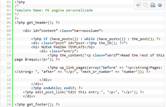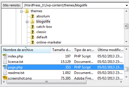Así en este ejemplo vemos …/wp-content/themes/blogolife, (siendo blogolife el tema activo ahora). Bien dentro de esta carpeta encontramos un fichero llamado page.php. Esa es la Default Template. Podríamos sacar una copia y partir de ahí modificar lo que deseemos o bien crearnos un fichero en blanco nombre_plantilla.php y comenzar a construir esa plantilla.