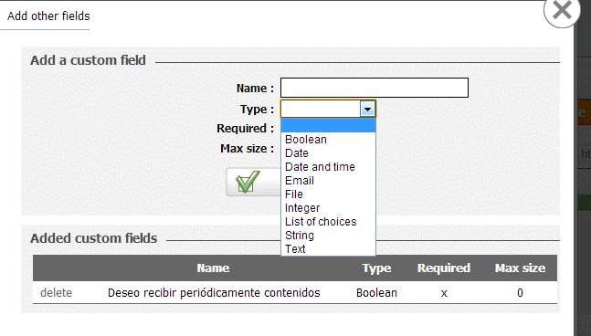 Si decidimos añadir nuevos campos,  nos lleva a una ventana tal como la que sigue donde crearemos un nuevo campo para el formulario, eligiendo el nombre, tipo, tamaño, si es requerido o no, etc.