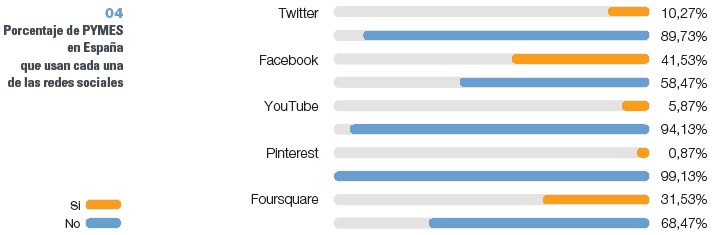 Según el ‘Estudio nacional sobre el uso de las redes sociales por parte de las Pymes españolas’ elaborado por la Fundación Banesto, la distribución de uso de las redes sociales por parte de las empresas, sería la siguiente: