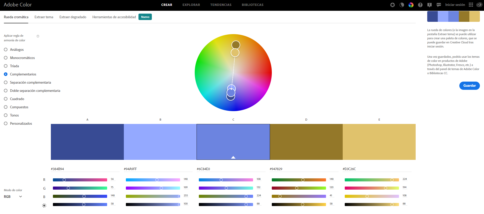 La rueda de colores es el método más común. Simplemente hay que seleccionar un color en la rueda y Adobe Color calculará automáticamente las armonías perfectas.