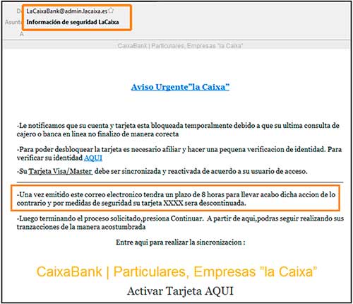 Por norma general siempre intentan asustar al destinatario e intentan que realicen una acción trasladándolos a una página web falsa en el que introduzcan datos personales, número de cuentas, claves bancarias, …