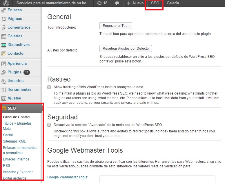 Al realizar la instalación del plugin en nuestro escritorio de wordpress encontramos unas nuevas entradas en el menú lateral y en el superior que nos permite llegar a todas las opciones de esta utilidad.