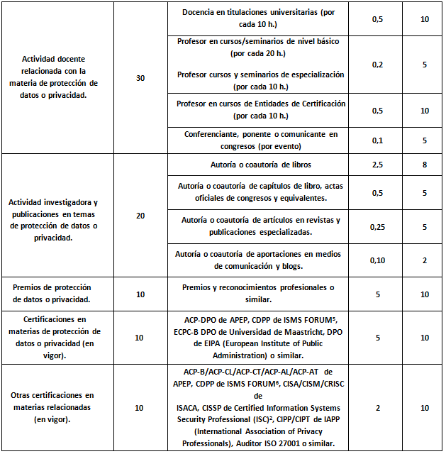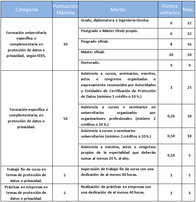 Si carecemos de experiencia DPO profesional previa o esta no supera la puntuación mínima por falta de años de experiencia, se valorarán los méritos según los Baremos publicados en el Esquema AEPD-DPD.