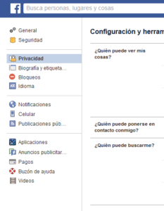 Pulsando “Configuración”, se nos abrirá una nueva página, donde podemos seleccionar “Privacidad”, desplegándose a la derecha la diferente configuración y editándola según nos convenga.