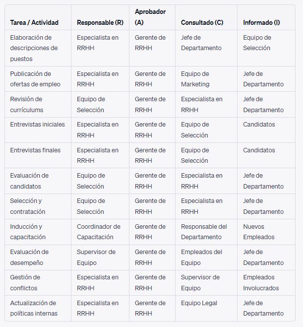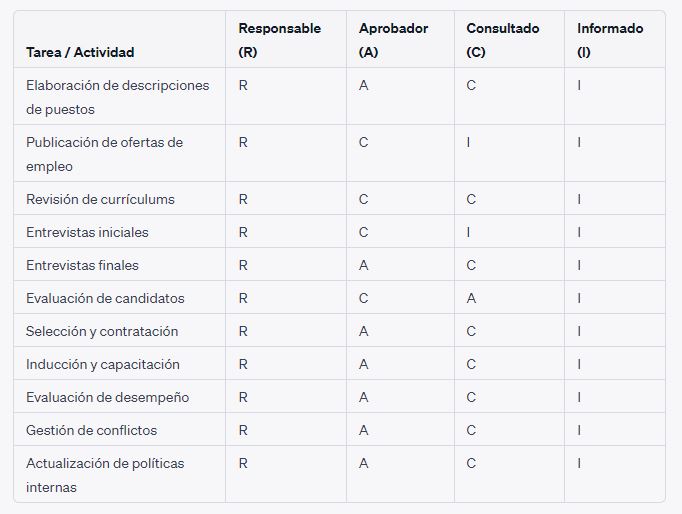 En el contexto de Recursos Humanos, crear una matriz RACI implica asignar roles y responsabilidades a diferentes tareas y actividades relacionadas con la gestión de personal y procesos de recursos humanos.