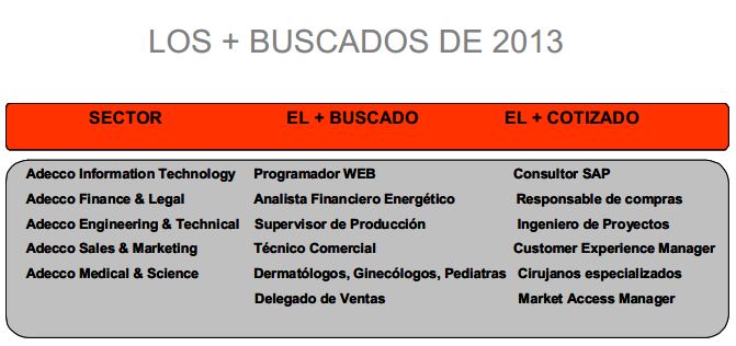 Este 2013 supone la octava edición de este informe anual que desde 2006 vienen publicando la consultora Adecco. Informe muy útil que nos pone al día sobre los perfiles más demandados. Ingenieros, médicos especialistas, responsables comerciales, programadores del ámbito tecnológico o nuevas figuras surgidas en el mundo del marketing son los perfiles estrella de este año.
